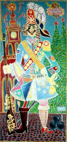 Russian folk art is a mine of information for the modern style of this artist.